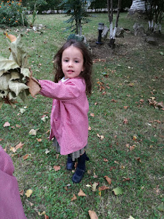 Hemos bajado al patio de los mayores donde tenemos un inmenso jardín con varios tipos de árboles y allí no hemos parado de recoger hojas. Las hay de todas las formas, tamaños y colores: